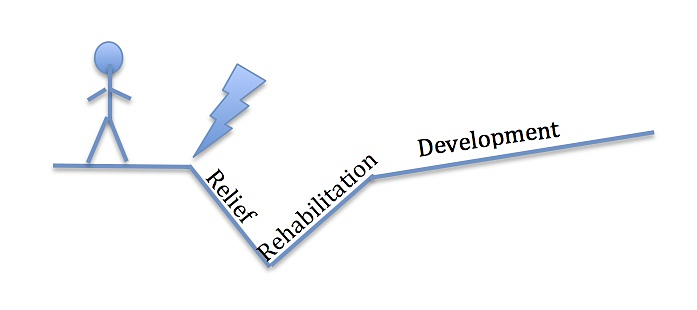 The graph illustrates that development is the most prolonged and sustained effort in helping individuals. This is the primary focus of Extra Mile. Often, people face crises—symbolized by the lightning bolt—such as natural disasters, job loss, or illness. These situations typically require immediate relief, including shelter, food, and essential services.